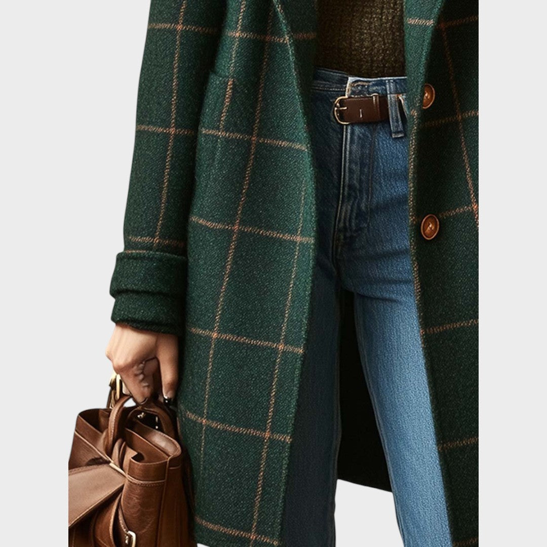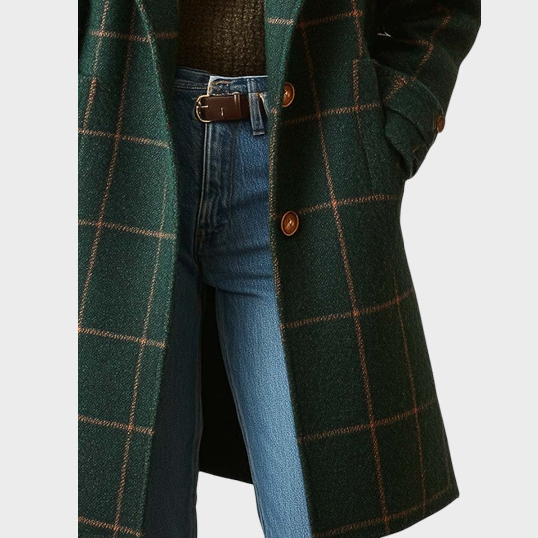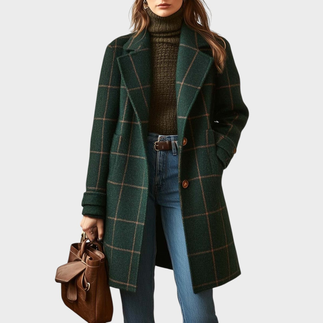 El abrigo Lisandra combina la sofisticación clásica con un toque moderno gracias a su estampado de cuadros verde intenso. Con un corte estructurado y elegantes botones frontales, ofrece una silueta distintiva que realza cualquier look. Su tejido cálido y suave lo hace ideal para los días fríos, mientras que los bolsillos laterales aportan practicidad sin sacrificar el estilo. Perfecto para transformar conjuntos sencillos en conjuntos refinados y encantadores.