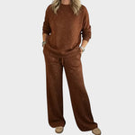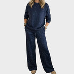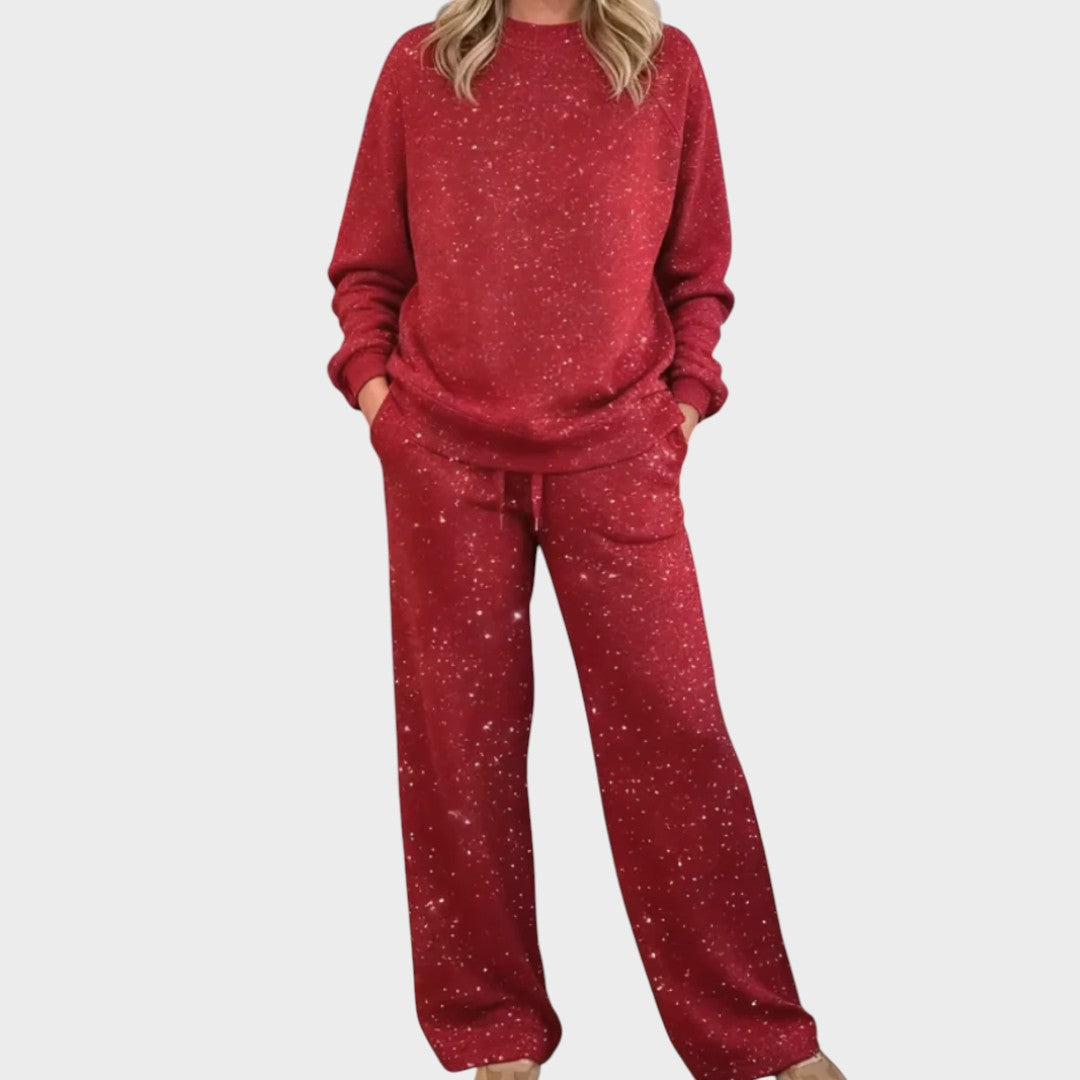 El conjunto Lana combina comodidad, estilo y un toque festivo, perfecto para las fiestas. Su sutil estampado brillante crea un look invernal acogedor y encantador. Con una sudadera suave y pantalones de corte recto, ofrece libertad de movimiento y una elegancia relajada. Es el conjunto ideal para celebrar la Navidad con comodidad, ya sea en familia, en casa o en salidas informales.
