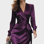 Sofisticado, sensual y atemporal: este vestido envolvente en satén color ciruela oscuro es la verdadera personificación de la elegancia moderna. La tela sedosa y fluida cae maravillosamente alrededor del cuerpo, mientras que la cintura con lazo acentúa tu silueta con sutil elegancia. Perfecto para eventos nocturnos, fiestas o cenas románticas, aporta un aura de confianza y encanto a todas las ocasiones.