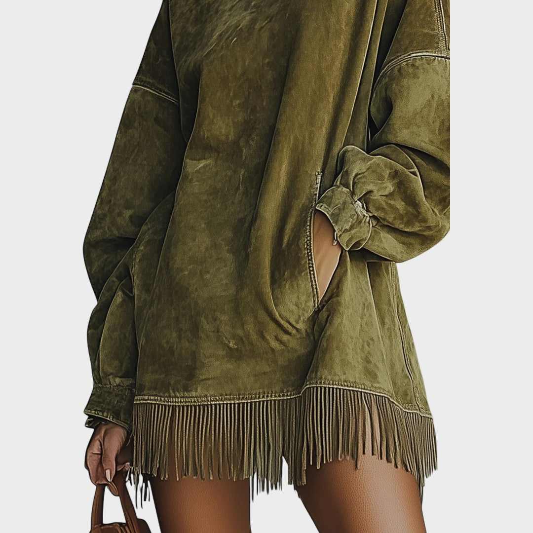 • Diseño sofisticado y elegante: El vestido Sheri está confeccionado en ante, con un tacto suave y sofisticado, perfecto para quienes buscan un look moderno y refinado. El fleco en el bajo le añade un toque único y con estilo.