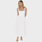 El corte ajustado realza la figura con naturalidad, mientras que la falda midi fluida aporta un toque refinado y a la vez divertido. Los tirantes anchos y el escote cuadrado crean un look moderno y clásico que evoca la elegancia francesa.