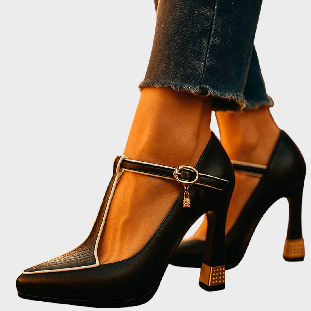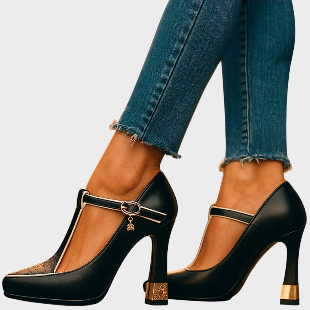 Eleva tu estilo con nuestros impresionantes tacones Rebeca, creados para la mujer moderna que busca sofisticación y comodidad. Confeccionados en piel de primera calidad, estos zapatos presentan un diseño de tira en T con detalles decorativos, un tacón grueso adornado con detalles brillantes y una elegante punta fina. Perfectos tanto para eventos formales como para el día a día, los zapatos Rebeca combinan la elegancia atemporal con un toque contemporáneo, asegurándote que destaques a cada paso.